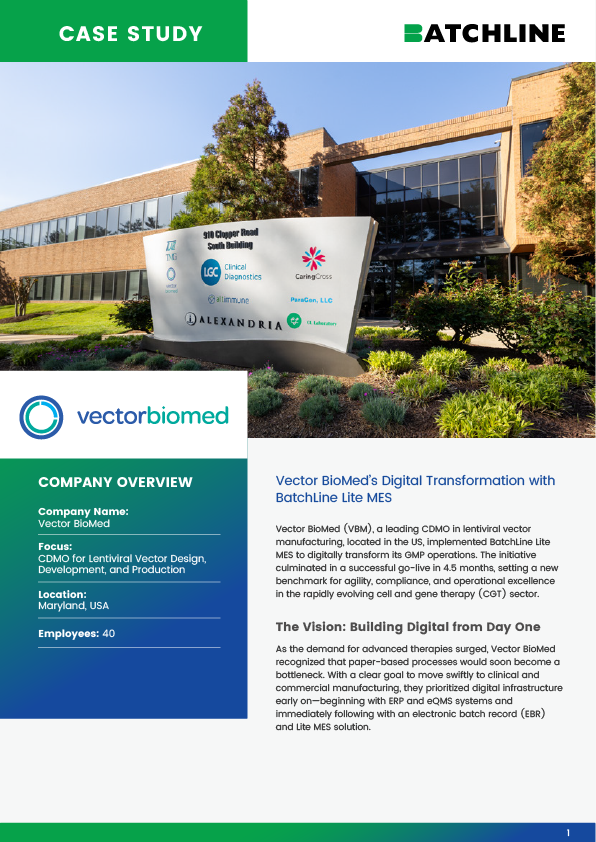 "We invite others in the industry to learn from our journey. The shift to electronic batch records with BatchLine Lite MES has been transformative in moving the company into the digital space to support our mission of providing low-cost, superior quality vectors and accelerating our client’s journey to clinical and commercialization."