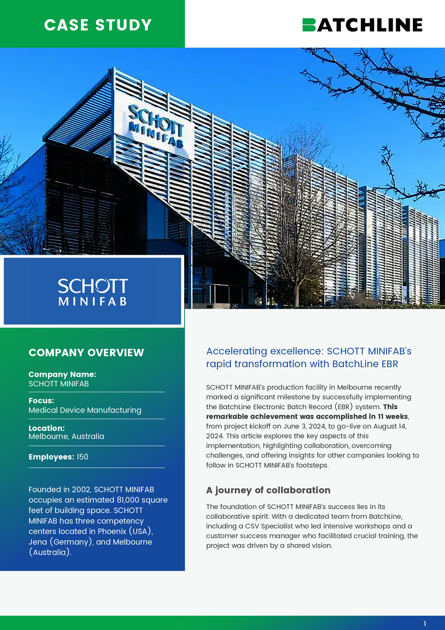 "BatchLine impressed us with professionalism, responsiveness, and a simple product that fits our needs. Promised a 12-week implementation, we achieved Go Live in under 11 weeks. With one dedicated resource, supported by IT, quality, and production teams, we collaborated with BatchLine using their templated documentation, which required minimal changes."
